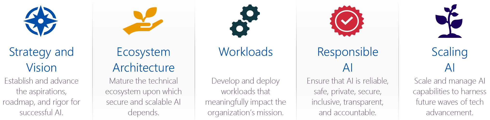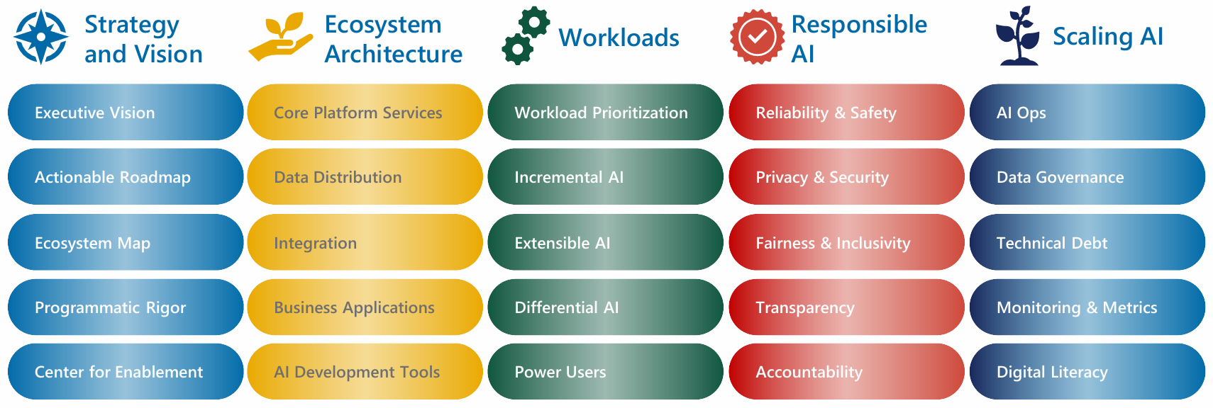 Figure 2: Use these five pillars to evaluate an organization’s maturity, risks, and opportunities in AI at any point in time. Then build your strategy to mitigate those risks, seize those opportunities, and mature the organization’s use of AI over time.