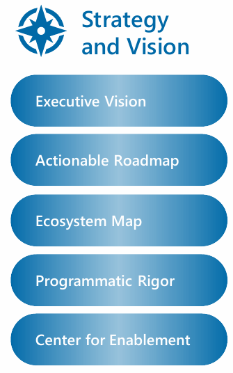 Simply “wanting AI” doesn’t cut it. So, our Strategy and Vision pillar sets forth five dimensions which begins with vision, extends to creating the actionable roadmap and architecture necessary to actualize that vision, and finally establishes the programmatic elements necessary to drive that vision to fruition. These dimensions help organizations formulate and take action on their big ideas.