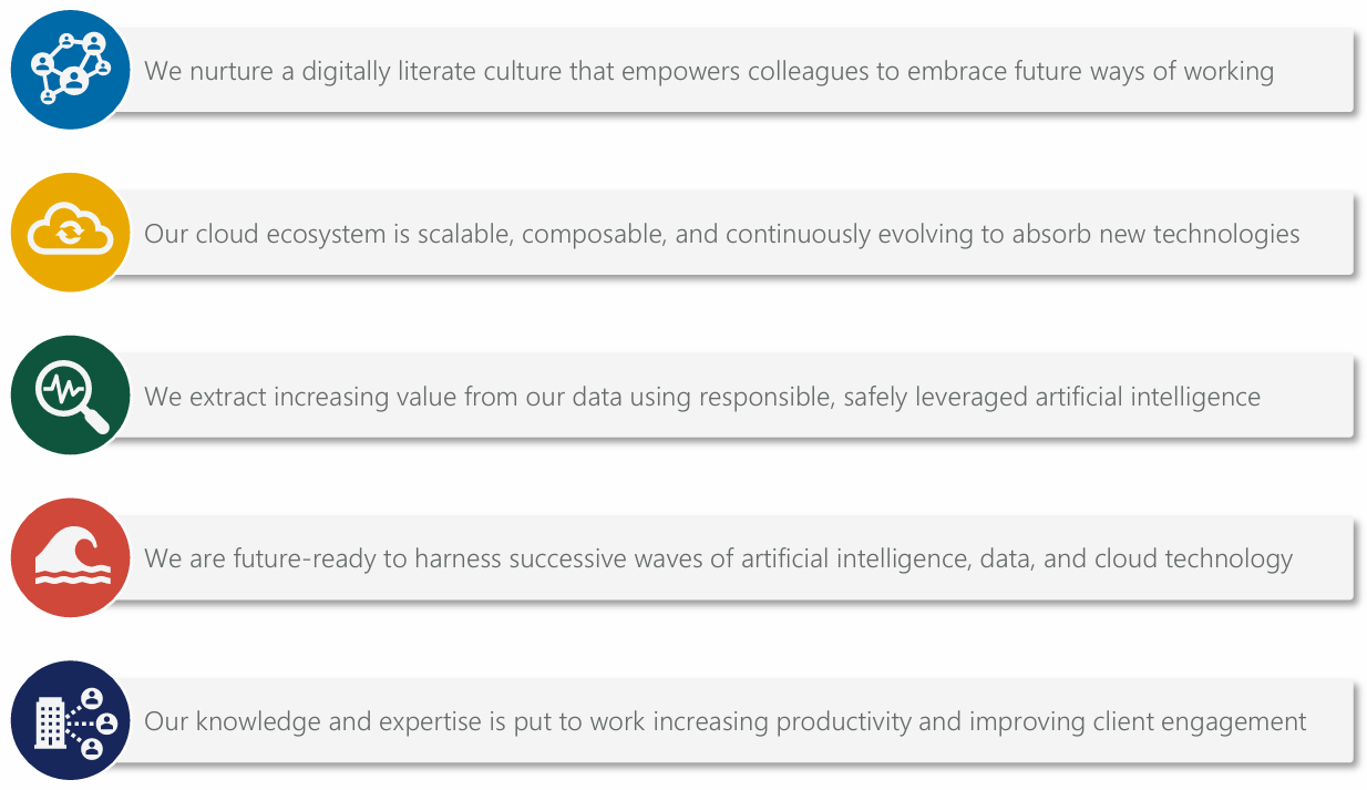 Figure 5 : A top-level executive vision for AI framing the aspirations for an organization embracing AI. This example includes building a digitally literate culture, creating a scalable and composable cloud ecosystem, extracting value from data safely, adopting a future-ready mindset and increasing AI knowledge and expertise.
