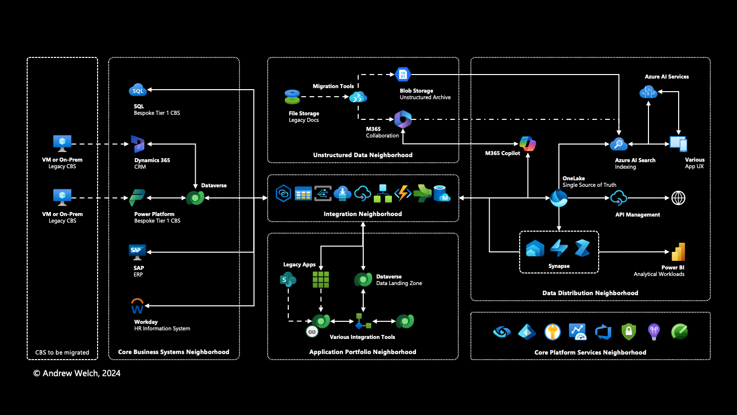 Data Distribution, which provides for data consolidation in (for example) OneLake, and for all manner of “downstream” data distribution such as search, APIs, data warehousing, analytical workloads, and use in AI-driven scenarios. We’ve also decided to place Microsoft 365 Copilot in the Data Distribution neighborhood as it—like many other scenario-specific Copilots that also reside there—relies on consuming, interpreting, and otherwise distributing data in response to user prompts. Note that M365 Copilot is hydrated with data from Microsoft 365 via the Microsoft Graph, and may be configured to consume data from elsewhere in the data estate, as well.