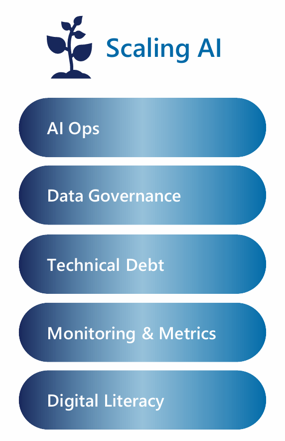 Second, there are human Digital Literacy considerations that should be thought about as you progress AI across the organization. There is a significant element of people-centric scaling and change management required here. In other words, the baking of AI into the way people work.