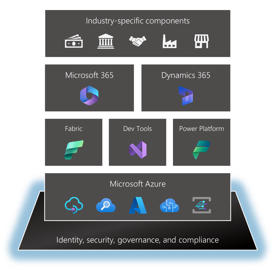 Figure 27: Microsoft’s major platforms or product families build upon one another. Fabric, Dev Tools, and Power Platform sit atop Azure services, and in turn Microsoft 365, Dynamics 365, and the industry-specific components are end-user applications dependent on the platform services sitting beneath them.